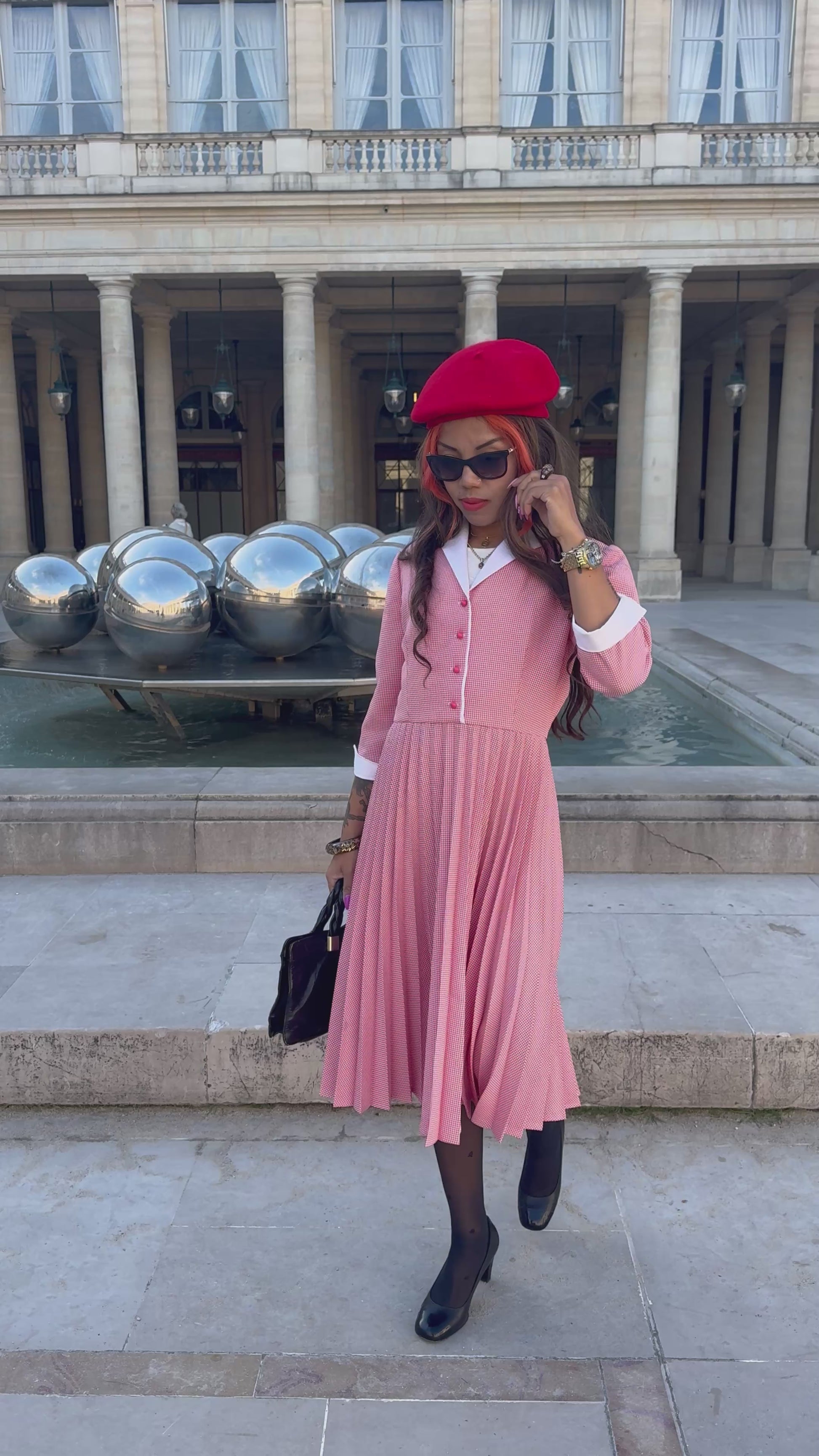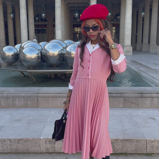 Sa teinte rose douce et ses détails contrastés apportent une touche féminine et raffinée, idéale pour un look vintage chic ou parisien.